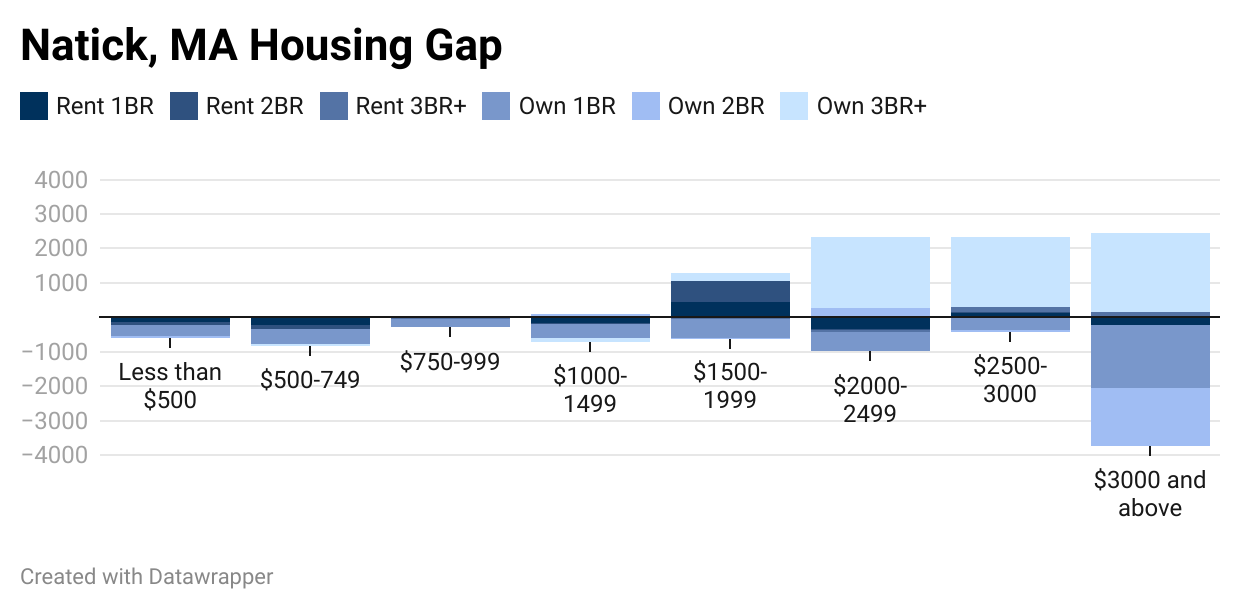For example, Natick has high incomes with a need for one to two bedroom housing. In contrast, Maywood has lower incomes and larger families that need units with three bedrooms or more. Their analysis found that the housing supply for Maywood has smaller units available, and Natick had larger units available, which does not align with either community’s housing needs.